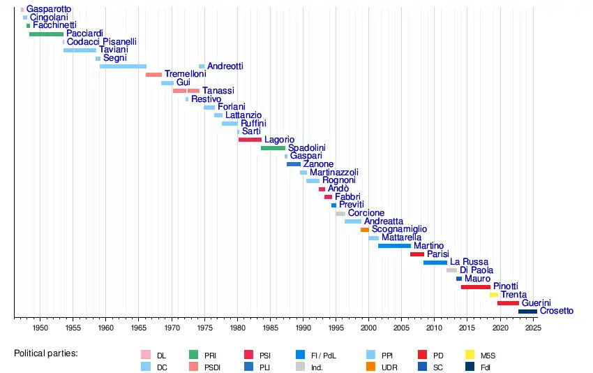 The first minister of war was Manfredo Fanti, a general of the Royal Italian Army, while the first minister of defence was Luigi Gasparotto, member of the Labour Democratic Party; the current office holder is Guido Crosetto, of the Brothers of Italy party, who has been acting as defence minister since 22 October 2022.[1]