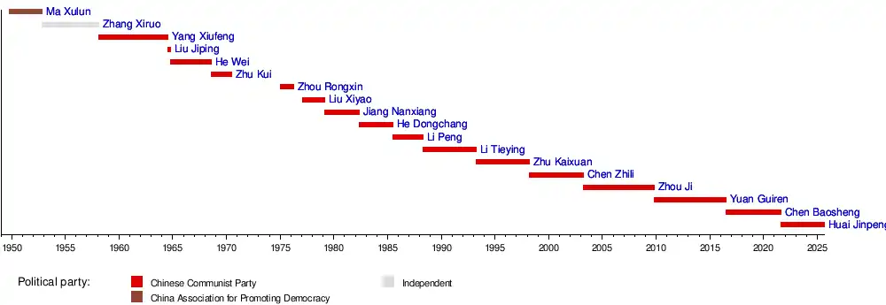 17 March 2003 | 31 October 2009 | 6 years, 228 days | Secretary of the Party Leadership Group of the Ministry of Education | Wen Jiabao | [18] |