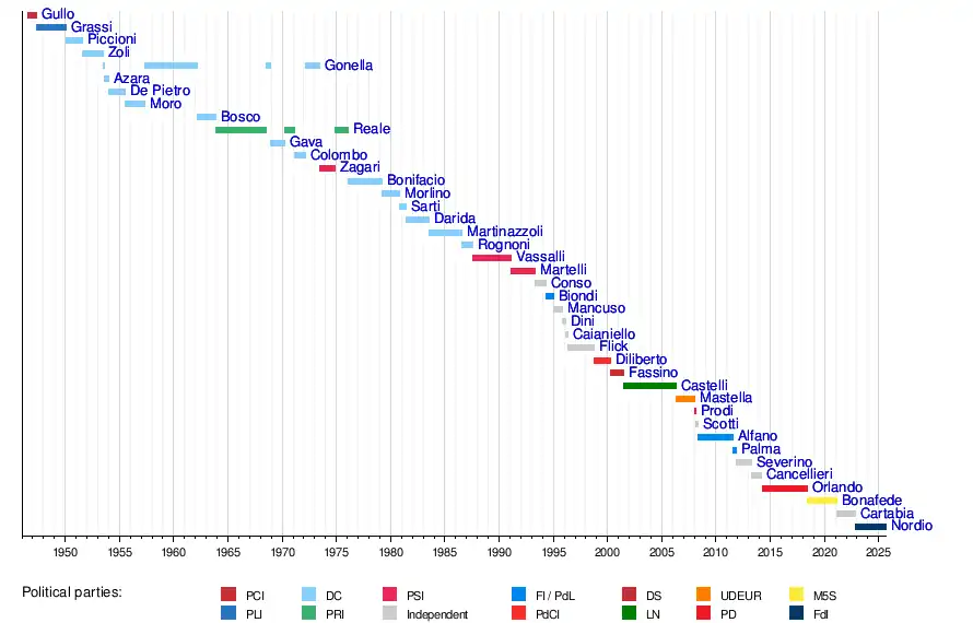 The first Italian minister of justice is Giovanni Battista Cassinis, member of the Historical Right, who held the office in 1861 in the government of Camillo Benso, Count of Cavour; while the longest-serving minister was Alfredo Rocco, who served in the fascist government of Benito Mussolini from 1925 until 1932. The current minister is Carlo Nordio, appointed on 22 October 2022 in the government of Giorgia Meloni.[1]