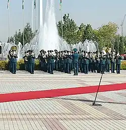 The House of Officers (Tajik: Хонаи мандати) is a cultural centre and gentlemen's club of the national army. Construction on the building took place between 2012 and 2016 and was built within the framework of a military agreement between the armed forces and the People's Liberation Army of China. It was commissioned by President Rahmon on 5 May 2016.[18] The building consists of five floors and basement area. Rooms in the building include a swimming pool, a large dining room, working rooms and service centres, assembly halls, recreation and entertainment areas and living compartments. There are approximately 20 bedrooms available in the building.[19][20] The six-storey building is located on Foteh Niazi Avenue in central squares in Dushanbe.[21]