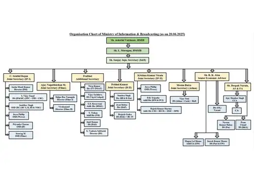 The Ministry of Information and Broadcasting is structured into various departments and divisions, each responsible for distinct aspects of media regulation, public broadcasting, film certification, and communication strategy. As of 20 June 2025, the official organisational chart outlines the roles of the Minister, Secretary, Joint Secretaries, Directors, and other senior officials overseeing functions such as print media, films, digital communication, and administration.[4]