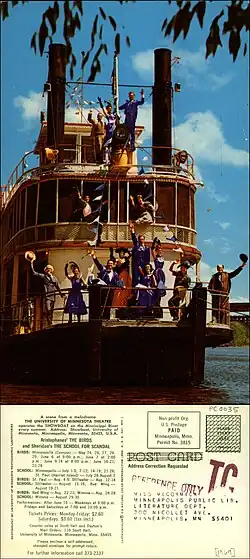 The paddleboat arrived in Saint Paul on April 3, 1958. The university had less than three months to prepare it for the season opening on June 26. Students helped to recreate the atmosphere of an 1890s showboat by painting walls, sewing curtains, reupholstering old theater seats, building scenery, and sewing costumes.[2]