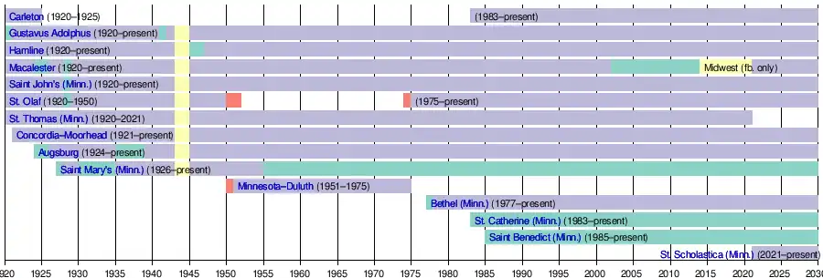 - ^ St. Olaf left the MIAC after the 1949–50 school year, before re-joining in the 1974–75 school year.