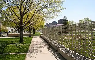 The memorial consists of a garden entitled Garden of Time: Landscape of Change and features a series of aluminum signs, each one of which describes an event in the United States women's suffrage campaign. A trellis bears the names of 25 leaders of the movement in Minnesota.[2][6]