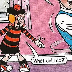 Minnie the Minx, created and drawn by Leo Baxendale, first appeared in The Beano in December 1953. Her first strip introduced her as "wild as wild can be" and showed her exasperated mother attempting to get her to be more creative rather than fight. Taking a book, Minnie then proceeds to beat her classmates during a revenge scheme using the scrapbook as a weapon. The closing panel shows her thanking her mother for the scrapbook stating she has "won nine scraps with it." Most of Minnie's earlier strips consisted of six-panel boxes; however, as her popularity grew, it quickly became more plausible to give Minnie her own full page with added colour. This introduced her trademark flaming red hair and red and black jersey.[3] Like many other Beano stars at the time, many of her later strips showed Minnie to get her comeuppance towards the end be it a cane, slipper or simply a case of karma. Minnie also appeared alongside Dennis the Menace in his own strip in the edition of 23 January 1954 of The Beano. In the strip, she swapped toys with Dennis for the day as she received his trusty catapult and he proceeded to 'menace' with her doll's pram. In the end, she got out of trouble scot free whilst Dennis had to suffer for all her minxing. It was possibly this that began their future eternal rivalry.