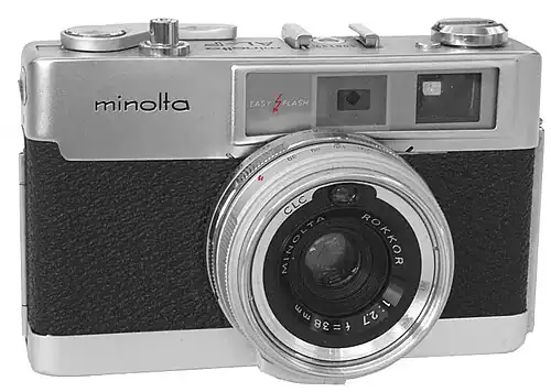 The camera had an automatic mode for flash photography ("Easy Flash"). Therefore, it had a guide number selector. A hot shoe for the flash gave further ease of flash usage. For manual exposure selection it offered shutter priority mode with preselection of five exposure times from 1/30 sec to 1/500 sec. The frame viewfinder was coupled to a superimposed rangefinder and had a mechanical horizontal parallax correction. For vertical parallax only a parallax arrow. The CdS exposure meter's aperture value proposal for the automatic aperture was visible through the finder, at the right side of the viewfinder image. The lens, a Rokkor 1:2,7/38mm, had only 4 elements in three groups, and a Seiko shutter. The meter's "eye" was placed within the filter ring of the lens.