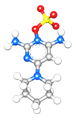 Minoxidil sulfate, also known as minoxidil sulfate ester or minoxidil N-O-sulfate, is an active metabolite of minoxidil (Rogaine, Loniten, others) and is the active form of this agent.[1][2] Minoxidil acts as a prodrug of minoxidil sulfate.[1] Minoxidil sulfate is formed from minoxidil via sulfotransferase enzymes, with the predominant enzyme responsible, at least in hair follicles, being SULT1A1.[1][2] Minoxidil sulfate acts as a potassium channel opener, among other actions, and has vasodilating, hypotensive, and trichogenic or hypertrichotic (hair growth-promoting) effects.[1][3] Its mechanism of action in terms of hair growth is still unknown, although multiple potential mechanisms have been implicated.[1]