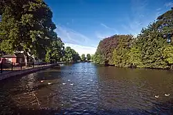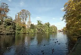 The slow flowing nature of the streams caused a lot of siltation in the pool, this combined with it being used as a sewer for the Close caused it to become dirty.[3] In 1772 the pool was cleaned and landscaped by the corporation. Poet Anna Seward was instrumental in landscaping the pool into a serpentine shape and developing a 'New Walk' along its southern bank.[4] By the mid 19th century it had become dirty again and five feet of mud was dredged in 1855. During these works cannonballs and shells from the Civil War were found in the mud.[3][5]