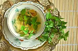 Mint tea is a herbal tea made by infusing mint leaves in hot water.[1] Mint tea made with peppermint leaves is called peppermint tea, and mint tea made with spearmint is called spearmint tea. There also exist teas that infuse peppermint and spearmint leaves. In Korea, traditional mint tea called bakha-cha (박하차) is made with East Asian wild mint leaves.[2] In India, traditional mint tea called pudina chai (पुदीना चाय) is made by steeping spearmint or peppermint in hot chai.[3][4]