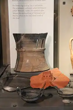 In the history of Aegean prehistoric archaeology, Heinrich Schliemann was the first person to coin the term "Minyan" after he discovered a distinct variety of dark-burnished pottery at Orchomenos (the mythical home of King Minyas).[1] Some of his contemporaries referred to the pottery as "Orchomenos Ware".[2] However, the term "Minyan Ware" ultimately prevailed since it romantically recalled the glorious (though tenuous) Minyans of Greek mythology.[2]