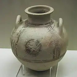 Minyan Ware from the Middle Helladic I period is decorated in the form of grooves on the upper shoulder of kantharoi and bowls.[8] During the Middle Helladic II period, stamped concentric circles and "festoons" (or parallel semicircles) became a common characteristic of decoration especially on Black (or Argive) Minyan Ware.[8]