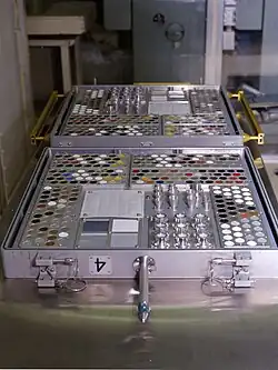 The Mir Environmental Effects Payload (MEEP) was a set of four experiments installed on the Russian space station Mir from March 1996 to October 1997 to study the effects of space debris impacts and exposure to the space environment on a variety of materials.[1] The materials used in the experiments were being considered for use on the International Space Station, and by exposing them at a similar orbital altitude to that flown by the ISS, the experiments provided an assessment of the performance of those materials in a similar space environment.[1] MEEP also fulfilled the need to examine the occurrence and effects of man-made debris and natural micrometeoroids through capture and impact studies.[1] The experiments were installed on the Mir docking module during STS-76,[2] and retrieved during STS-86.[3]