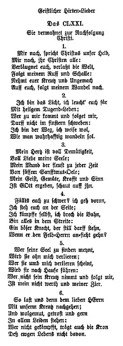 - ^ "Mir nach, spricht Christus, unser Held". liederdatenbank.de (in German). Archived from the original on 15 August 2022. Retrieved 24 September 2023.