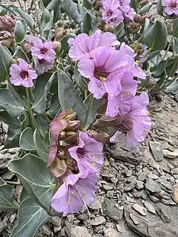 Mirabilis alipes is a species of flowering plant in the four o'clock family known by the common name winged four o'clock. It is native to the southwestern United States from eastern California to western Colorado, where it grows in brush, woodland, and dry mountain slope habitat. It is a perennial herb growing in a clump near 40 centimetres (15+3⁄4 in) tall and up to 80 centimetres (31+1⁄2 in) wide. The leaves are oppositely arranged on the spreading stem branches. Each fleshy leaf has an oval or rounded blade up to 7 to 9 centimetres (2+3⁄4 to 3+1⁄2 in) long and is hairless or sparsely hairy. The flowers occur in leaf axils on the upper branches. Five to nine flowers bloom from a cup-shaped involucre of several partly fused bracts. Each five-lobed flower is about 1.5 centimetres (5⁄8 in) wide and magenta in color; cream-colored flowers are also known.