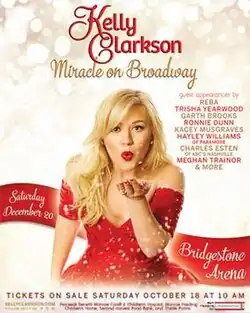 Miracle on Broadway was an annual Christmas benefit concert by American recording artist Kelly Clarkson. Presented by Live Nation, the first of a planned annual series of benefit concerts was held at the Bridgestone Arena in Nashville, Tennessee on December 20, 2014 and featured musicians Reba, Trisha Yearwood, Garth Brooks, Ronnie Dunn, Kacey Musgraves, Hayley Williams, Chad Gilbert, Charles Esten, Meghan Trainor, Martina McBride, Kix Brooks, and Deborah Allen performing renditions of various Christmas songs and tracks from Clarkson's Christmas album Wrapped in Red (2013). The concert raised over US$500,000 ticket sales and donations for four charities based in Nashville: Monroe Carell Jr. Children's Hospital at Vanderbilt, Monroe Harding Children’s Home, Second Harvest Food Bank, and Thistle Farms. Clarkson had also announced plans to turn Miracle on Broadway into an annual benefit concert and planned to hold one in Bridgestone Arena on December 18, 2015.[1] However, this concert was cancelled due to Clarkson's health complications during her second pregnancy. The 2016 concert was held on December 16, 2016.[2]