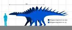 Miragaia was long yet relatively lightweight in comparison to other stegosaurs, reaching 6–6.5 metres (20–21 ft) in length and 2 metric tons (2.2 short tons) in body mass.[7][8] Histology shows that the holotype specimen reached skeletally maturity, after the age of at least 21 to 22 years old or 25 years old.[9]