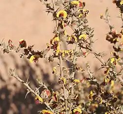 Mirbelia trichocalyx is a species of flowering plant in the family Fabaceae and is endemic to the south-west of Western Australia. It is a dense, erect, spiny shrub that typically grows to a height of 15โ75 cm (5.9โ29.5 in) and has orange or yellow and red flowers from July to October. It grows on plains, hills and breakaways in the Avon Wheatbelt, Coolgardie, Esperance Plains, Geraldton Sandplains, Jarrah Forest, Mallee and Swan Coastal Plain bioregions.[2]