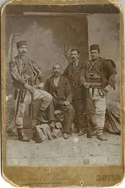![]() Atsev (standing in left) with comrades in Sofia. | |