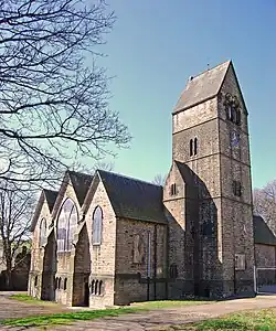 The 13th-century St Mary's Church was rebuilt in 1826 but proved too small for the growing population and was regarded as too minor for the growing district. A new church, designed by Sir George Gilbert Scott, was built a few yards to the northwest, on the site of Castle Hall, a mansion then home to the families of Mirfields (sometimes spelled Mirfin), Hetons and Beaumonts.[9] At Scott's suggestion, the tower of the earlier church, which includes some medieval work, was retained.