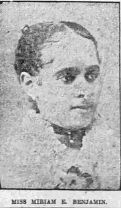 Under the pseudonym E. B. Miriam, Benjamin also composed musical pieces, including songs and marches for piano and band. In 1895, the Boston-based magazine Women's Era reported "Miss Miriam Benjamin has composed a march which is now upon the market, the 'Boston Elite Quickstep.' It has been played by Sousa's band, and is published by Ross of West street, this city. The publisher is so well pleased with it that he offers to take any future work of Miss Benjamin. By the way, the author is published as E. B. Miriam."[25] One of her compositions was used by Theodore Roosevelt's presidential campaign in 1904.[26][27]