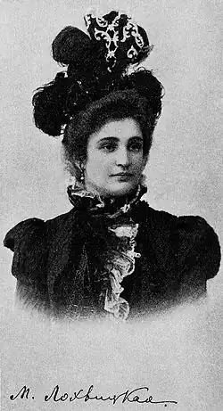 Mirra Lokhvitskaya (Russian: Ми́рра Ло́хвицкая; born Maria Alexandrovna Lokhvitskaya – Russian: Мари́я Алекса́ндровна Ло́хвицкая; November 19, 1869 – August 27, 1905) was a Russian poet who rose to fame in the late 1890s. In her lifetime, she published five books of poetry, the first and the last of which received the prestigious Pushkin Prize.[1] Due to the erotic sensuality of her works, Lokhvitskaya was regarded as the "Russian Sappho" by her contemporaries, which did not correspond with her conservative life style of dedicated wife and mother of five sons. Forgotten in Soviet times, in the late 20th century Lokhvitskaya's legacy was re-assessed and she came to be regarded as one of the most original and influential voices of the Silver Age of Russian Poetry[2] and the first in the line of modern Russian women poets who paved the way for Anna Akhmatova and Marina Tsvetaeva.[3]