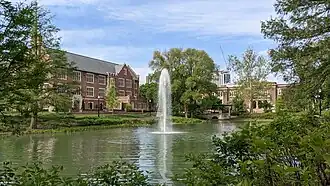 Historically, the lake was spring-fed, and sat on the property of William Neil. The trustees in charge of purchasing land for the new Ohio Agricultural and Mechanical College, which would later become the Ohio State University, chose Neil's land, possibly after drinking from the spring.[2] The spring dried up in 1891 when the city of Columbus struck the source of the spring while installing a sewer line through campus.[3] Between 1891 and 1972, the lake was filled using water from the Olentangy River. The water source was subsequently provided by the city of Columbus municipal water supply, at a new location on campus near the location of the original lake.[4]