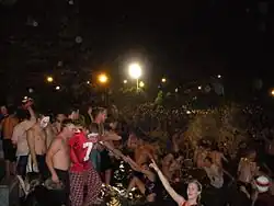 It was a tradition for students to jump into the lake at night in the week leading up to the annual football game between the Ohio State Buckeyes and the Michigan Wolverines. Although students have jumped into Mirror Lake since 1969, the modern tradition started in 1990 when “Marmaduke” and members of AEPi led the marching band and some students on a traditional march around campus. At the end of the parade — at Mirror Lake — students made the celebratory jump.[6] Approximately 12,000 people either jumped or were near the lake for the 2009 jump.[7] Jumps have occurred several times outside of Michigan Week, including on the night of May 1, 2011 when students jumped into the lake after the death of Osama bin Laden.[8] The Mirror Lake Jump events were not university sponsored, and people were encouraged by university officials to not participate in the events.[9] The tradition ended in 2015 after a student died, and the university began enforcing policies to prevent jumps.[10] Jumping into Mirror Lake is a fourth-degree misdemeanor, however police acknowledged that they ignored this during jump events in order to focus on the safety of those present.[11]