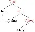 When the structure is pronounced, it linearises in the following order: specifiers precede heads, and heads precede their complements. So when a sentence like that in the diagram below is pronounced, 'John' precedes the V-v-T chain, which in turn precedes 'Mary', the latter being the specifier of V. However, English is a VO language, which means that the morphological word 'loves' associated with the V-v-T chain is spelled in v, deriving the correct word order.