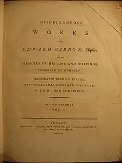 - ^ the full title of 1796 (and in square brackets, that of 1814) is, [The] Miscellaneous Works of Edward Gibbon, Esquire; [Esq.] with Memoirs of his Life and Writings, composed by himself.[:] Illustrated from his Letters, with occasional notes and narrative, by [the Right Honourable] John, Lord Sheffield. in Two Volumes [a New Edition, with Considerable Additions in Five Volumes].