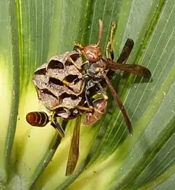 The nests of Mischocyttarus mexicanus cubicola can be founded by anywhere from one to twenty females. Even through there is an early and late period for nests, the nests can be initiated during any part of the year. The founders of new nests are usually born at the same time and the nests they found are not too far from their natal nest site.[8] Each nest can have one or more queens and in addition there is a range of female sexual development. With that said, most females have the capability of becoming a queen, as most are reproductively viable.[8] These nests have combs of open cells that consist of paper that attached to leaves by a stem. The life cycle of the nest can be divided into two stages: pre-daughter and post-daughter stages, also known as pre-eclosion and post-eclosion nests.[9] The lifetime of a nest is estimated to be around eight months, although many nest disintegrate before this.[10]