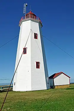 Miscou Island Lighthouse is an 24.3-metre (80 ft)-tall landfall lighthouse located on the North-Eastern tip of Miscou Island, at the entrance of the Chaleur Bay. It was built in 1856[3] and currently in use by the Canadian Coast Guard who owns the lighthouse, the land it is on, and also maintains it. It was built due to the shipwrecks that happened each year that could be prevented by a lighthouse. James Murray from Newcastle won the bid to construct the lighthouse.[4] It is a federal Heritage Building that is open to the public to explore. In 2009 a parking area, washrooms, picnic area and a deck around the lighthouse was added.[3]