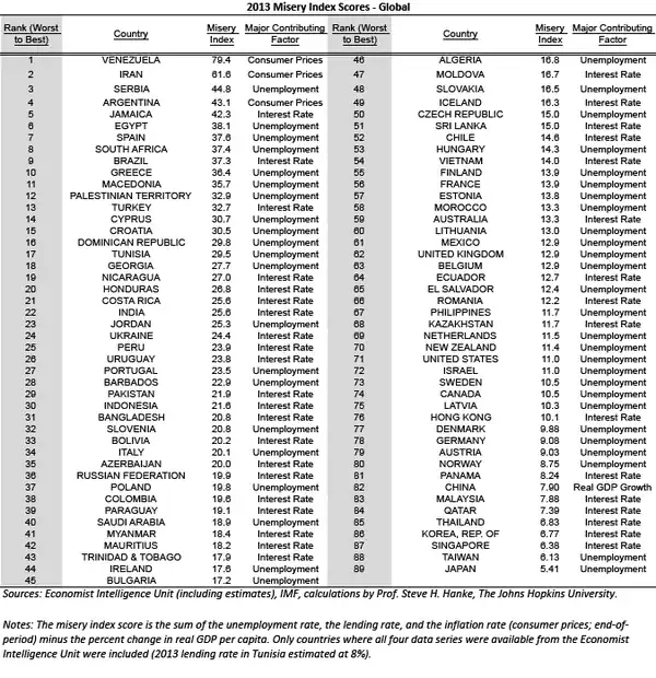 In 2013 Hanke constructed a World Table of Misery Index Scores by exclusively relying on data reported by the Economist Intelligence Unit.[5] This table includes a list of 89 countries, ranked from worst to best, with data as of December 31, 2013 (see table below).