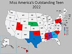 Miss America's Outstanding Teen 2022 was the 15th Miss America's Outstanding Teen pageant held in Orlando, Florida. Due to the COVID-19 pandemic, the planned 2021 edition was originally scheduled on August 8, 2020, the preliminary competitions were also scheduled on August 4–6, 2020, but it was postponed indefinitely.[1] It has been announced that pageant would be held on July 10, 2021, with preliminary competitions were held on July 7–8, 2021.[2]