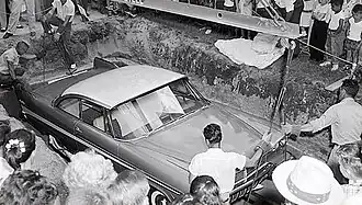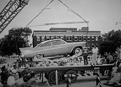 In the years leading up to the anticipated opening of the vault, some speculating the car would be found in near pristine condition, and others concerned moisture may have entered the vault causing damage.[1][26] It was unknown if a nearby 1973 construction accident involving damage to a water main that flooded the area, had affected the vault.[27] After eighteen months of preparation by volunteers, the vault was opened on June 14, 2007, during the state's centennial celebration.[9] In press interviews, the 2007 organizing committee co-chairman Sharon King Davis acknowledged that she had named the vehicle Miss Belvedere,[7] though the official website used leading up to the event did not use the nickname.[28] Interest in the event went viral, with news organizations and interested people from abroad attending the event.[29] Organizers had made arrangements with vehicle customizer Boyd Coddington, under a sponsorship arrangement, to use the sponsor's products in starting the car once removed from the vault.[30][31] A local crane service volunteered to lift the car from the vault, and customized lifting equipment was fabricated. An identical model Plymouth Belvedere was found and test lifts were made with the vehicle to verify the center of gravity for the lift.[32]
