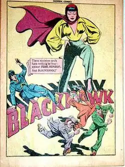 Miss Fear (or simply, Fear) was a recurring character in Blackhawk comics (published by Quality Comics, later bought by DC Comics) between 1946 and 1948. Her first appearance in Modern Comics #49 (May, 1946) told her origin as daughter of the slain leader of an obscure nation called Zorania. When Blackhawk and his men arrived to investigate the murder, they found Fear always a half-step ahead on her vendetta, ruthlessly avenging her father with a Tommy gun.