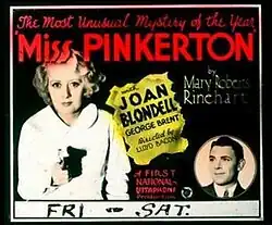 Miss Pinkerton is a 1932 American pre-Code comedy mystery film about a nurse who becomes involved in a murder investigation.[1] It stars Joan Blondell, George Brent and Ruth Hall. The film is adapted from a book with the same title, by American novelist Mary Roberts Rinehart.