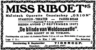 Initially the troupe's original stories were written by Tio himself.[3] By the late 1920s he had hired Njoo Cheong Seng, a journalist and writer, to help produce original scripts.[4] Works by Njoo which the troupe performed included Kiamat (Apocalypse), Tengkorak (Skull), and Tueng Balah,[5] while Tio wrote such works as R.A. Soemantri. These stories were most often filled with action, and, though written in detail, left room for improvisation. When Miss Riboet proved highly popular as a swordfighter in these plays, as well as a kroncong singer, the troupe was named after her.[3]
