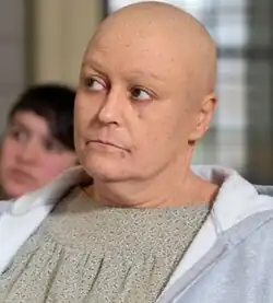 Miss Rosa undertakes chemotherapy to treat her cancer, which leaves her bald. Rosenblat did not shave her head for the role because she worried about other roles.[2] She had to wear a silicone "appliance" on her head and neck. Each morning on set makeup artist Josh Turri made up the appliance onto her.[1] The process would take approximately three hours and Turri added false beauty marks, eyebrows and small veins to complete Miss Rosa's look.[3] Rosenblat described him as "utterly brilliant and a perfectionist ... so you got this entirely organic sense that I was utterly bald and suffering [from] cancer."[1] While on set fellow actors and crew members incorrectly assumed she had shaved her head.[1] The weather during filming also affected Miss Rosa's costumer. During warm weather crew shielded Rosenblat from the sun with umbrellas because the heat would cause the make up to crack. Other breaches were caused by perspiration and Turri would drain water from underneath the prosthetics prior to repairing it.[3] At the end of each shoot it took Rosenblat 45 minutes to remove the appliance.[1]
