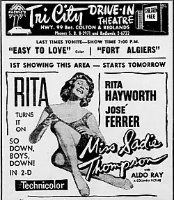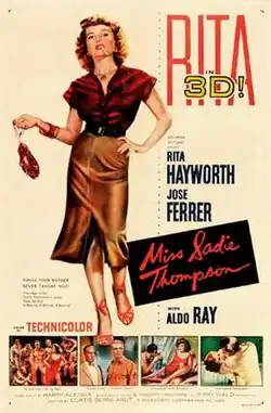 Miss Sadie Thompson is a 1953 3-D American musical romantic drama film directed by Curtis Bernhardt and starring Rita Hayworth, José Ferrer, and Aldo Ray. The film was released by Columbia Pictures. The film is based on W. Somerset Maugham's 1921 short story "Miss Thompson" (later retitled "Rain"). Other film versions include Sadie Thompson (1928) starring Gloria Swanson, Rain (1932) starring Joan Crawford, and Dirty Gertie from Harlem U.S.A. (1946).