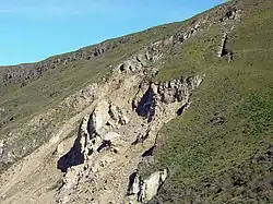 Mission Peak has a large (300 m wide by 1200 m long) landslide that started in 1998 due to the El Niño rains. Landslides had recurred here in the geological past.[25] The landslide threatened new housing, and local development regulations were changed to address the geotechnical hazards.[26]