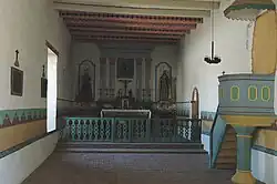 Fr. Fortuni was replaced by Fr. José Gutiérrez, a Franciscan friar from South America. Fr. Gutierrez continued to build and increased the agricultural effort.[24] By 1832 the mission had 27 rooms in the convento or priest's quarters, with a great adobe church at the east end, and a wooden storehouse (the original mission chapel) at the west end. Completing this enclosure were workshops where the Indians were taught to be craftsmen and created the items needed to help the mission be self-sufficient. Along the back of the courtyard were the living quarters and workrooms for the young Indian girls. In addition to the quadrangle, there were orchards, gardens, vineyards, fields of grain, a gristmill, houses for the soldiers and Indian families, a jail, a cemetery, and an infirmary.[25]