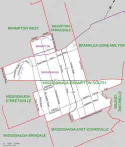 It consisted of the parts of the cities of Mississauga and Brampton bounded by a line drawn from the intersection of Highway 401 with the northeastern limit of the City of Mississauga, south along the city limit, southwest along Burnhamthorpe Road East, northwest along Central Parkway East, southwest along Highway 403, northwest along Mavis Road; thence northwesterly along said road to Eglinton Avenue West; thence southwesterly along said avenue to Terry Fox Way; thence northwesterly along said way to Britannia Road West; thence northeasterly along said road to Mavis Road, southwest along Highway 401, northwest along Mississauga Road, northeast along the northwestern limit of the City of Mississauga, northwest along McLaughlin Road, northeast along Steeles Avenue East, southeast along Kennedy Road South, northeast along the northwestern limit of the City of Mississauga, southeast along Dixie Road, and northeast along Highway 401 to the point of commencement.