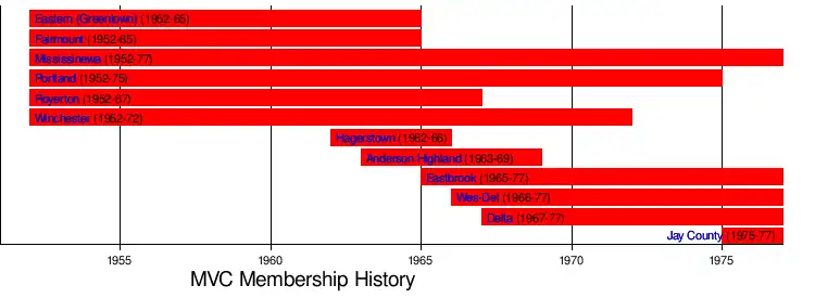 The Mississinewa Valley Conference was an IHSAA-sanctioned conference based in East Central Indiana that lasted between 1952[1] and 1977. The conference started out as a conference for larger rural schools as a way to provide a higher level of competition than their respective County Conferences typically provided. The conference was stable for its first decade, but consolidation and more regionally based conferences with schools of similar sizes had schools defecting the MVC. The conference ended in 1977, with three schools forming the Classic Athletic Conference, and one team each joining the Mid-Eastern and Mid-Indiana conferences.