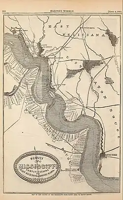 This is a list of notable places on the Mississippi River between roughly St. Louis, Mo. and the Gulf of Mexico at the time of the American Civil War, listed from north to south. Where locations are opposite each other at the same point along the River, the westernmost is listed first.[23] Steamboats of the era were fueled by wood (and coal as well) and the wood-fueled steamers burned something like 70 cords of wood per day.[24] Therefore, there were "hundreds of wood yards" along the Mississippi during the steamboat era, "one every several miles on the busiest sections of the river."[25]