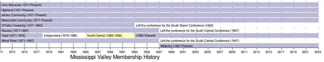 The Mississippi Valley Conference was formed in 1971 and has been one of the most stable conferences in Illinois high school athletics. The MVC was initially formed by Civic Memorial, Highland, Jersey Community, Mascoutah, O’Fallon, Roxana, Triad, and East Alton-Wood River High Schools. Ironically, the name Mississippi Valley had been used 2 times previous with the first occurrence happening in 1922 with teams from Macomb, Carthage, Pittsfield and Quincy from Illinois and Fort Madison and Keokuk in Iowa. This incarnation of the conference only lasted one season.[1] In 1957, the name was resurrected with teams from East Moline, Moline and Rock Island from Illinois joining an Iowa conference by the same name that included teams from Cedar Rapids and Davenport Iowa. This league is still in operation today in Iowa, however, the three Illinois schools left at the end of the 1969 school year.[2]