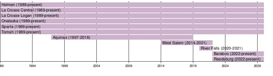In 2014, West Salem began competition in the Mississippi Valley Conference for football only, remaining in the Coulee Conference for all other sports.[4] Aquinas left the MVC's football roster in 2019 when they joined the Southwest Wisconsin Activities League as associate members for that sport.[5] The next year, a comprehensive realignment of Wisconsin high school football conferences was implemented by the WIAA with input from the Wisconsin Football Coaches Association to run on a two-year cycle.[6] All six of the MVC's public high schools (Central, Holmen, Logan, Onalaska, Sparta and Tomah) remained in the conference with associate members River Falls (Big Rivers) and West Salem (Coulee) filling out the ranks.[7] River Falls and West Salem returned to their respective conferences for the 2022-2023 realignment cycle with two schools from the Badger Conference (Baraboo and Reedsburg) replacing them.[8] This alignment will stay in effect through at least the 2026-2027 competition cycle.[9][10]