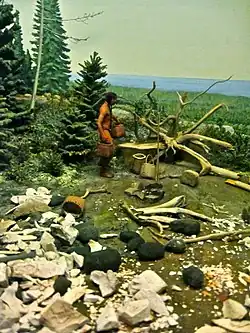 The native copper, as well as the technique of cold working it, is believed to have come from the Great Lakes area, hundreds of miles to the north of the Cahokia polity and most other Mississippian culture sites, although the copper workshops discovered near Mound 34 at Cahokia are so far the only copper workshops found at a Mississippian culture archaeological site.[5] Researchers at Northwestern's School of Engineering and Applied Science used an electron microscope to analyze pieces of the flat copper sheets found during excavations at the Mound 34 site at Cahokia. The researchers found that the metal had been repeatedly heated and cooled and while it was softened by the heat, had been hammered, a process known as annealing, similar to how blacksmiths work iron. They were also able to determine that the Cahokian coppersmiths had heated the copper in a wood fire to produce sufficient heat for this process.[6][7] This process of heating and hammering was repeated over and over until a sheet of the desired thickness was obtained and was sufficient to work the copper into very thin sheets.[6] Researchers have also tried different techniques to duplicate how larger pieces were manufactured. They determined that the larger pieces had not been laminated together but had most likely been riveted together with small copper knobs. Researchers were also able to determine that the artisans cut the copper into the desired shapes by bending the sheet metal back and forth until it broke in the desired location.[7]