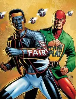 ![]() Michael Holt and Terry Sloane, both versions of Mr. Terrific. Cover of JSA #70, art by Dave Gibbons | |