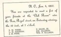 Founding members: Samuel Manning Todd, a drygoods merchant from Utica, New York, who arrived in New Orleans by way of Mobile, Alabama, like a few others.[12][13] Frank Shaw, Jr., commission merchant from New York State; Lloyd Dulany Addison (son of Walter Dulany Addison, of the Oxon Hill Manor Addisons, members of the Tidewater gentry) born in Kentucky,[14] partner Bullitt, Miller & Co. merchants and cotton factors; Dr. John H. Pope, credited with naming the group, from New York State originally,[15] and Joseph Ellison, owned Pope, Ellison & Co., commission merchants-Pope was also a pharmacist owning Pope's Drugstore at the corner of Jackson and Prytania where this small coterie initially organized, he was born in Louisville, Kentucky; brother William Ellison, partner of firm Starke & Ellison, Cotton Brokers was born in Pittsburgh, Pennsylvania.[15]