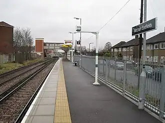 Mitcham Eastfields (initially known as Eastfields during planning and construction)[3] is a railway station in London, United Kingdom, which opened on 2 June 2008.[4] The infill station is located at Eastfields Road level crossing,[3] in an area previously poorly served by public transport. The nearest station was Mitcham Junction, which along with Mitcham tram stop, was over 1 mile (1.6 km) from the district.[5] It is in fare zone 3.[6]